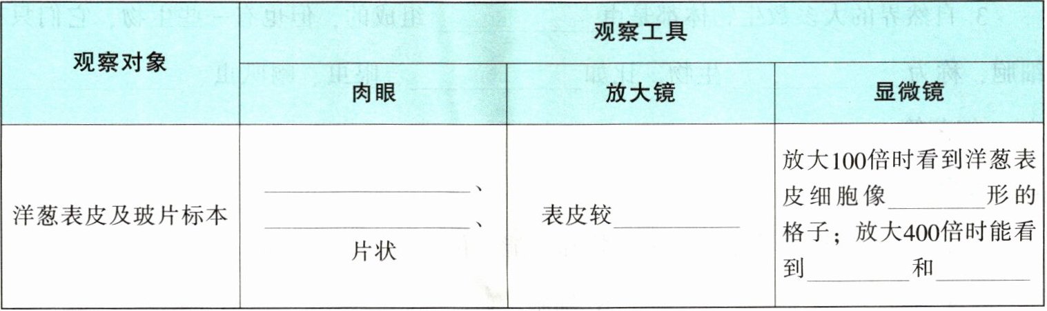 3. 分别用肉眼、放大镜、显微镜观察洋葱表皮,并将下面的记录表补充完整。