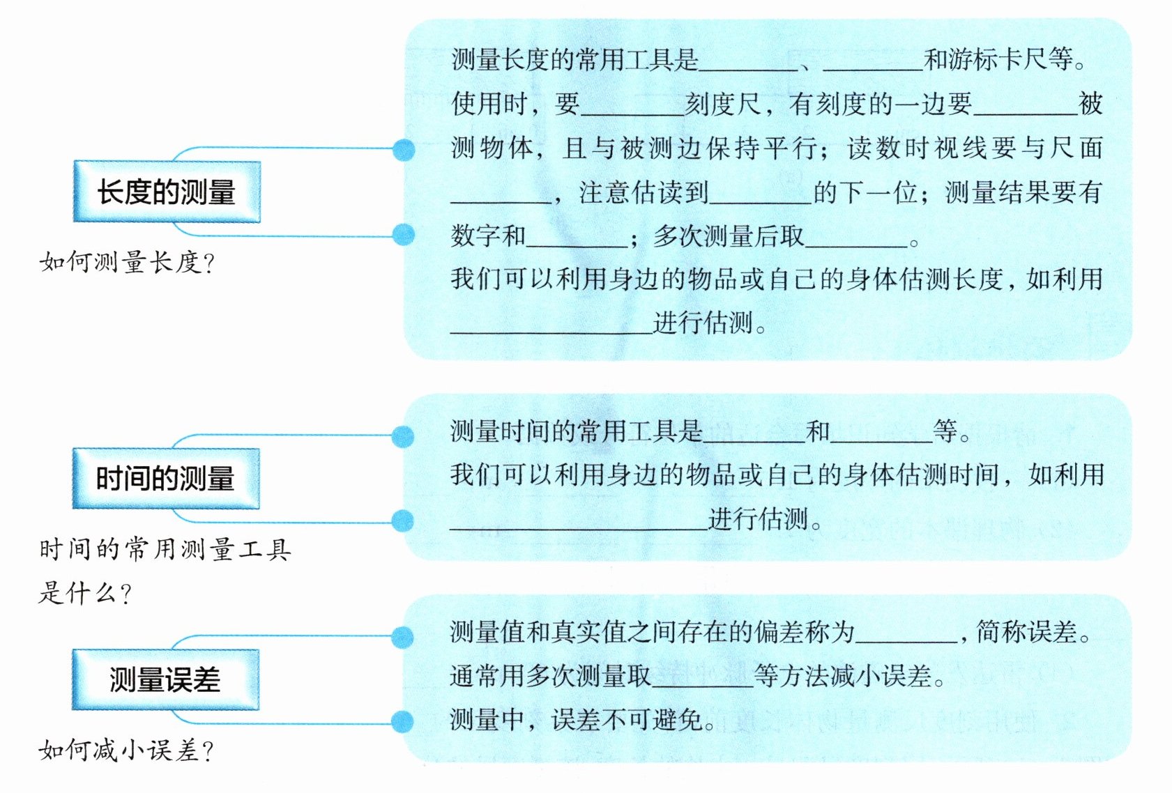 m km dm cm mm μm nm 10³ 10 10² 10³ 10⁶ 10⁹ s h min ms μs 60 60 10³ 10³ 直尺 卷尺 正确放置 紧贴 垂直 分度值 单位 平均值 手臂的长度(其他合理答案也可) 钟 表 脉搏的跳动规律(其他合理答案也可) 测量误差 平均值