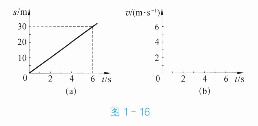 13. 一物体做匀速直线运动,其运动的路程$s随时间t变化的图像如图1 - 16(a)$所示。请根据图$1 - 16(a)$,在图$1 - 16(b)中画出物体运动的速度v随时间t$变化的图像。