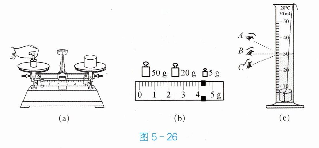 $g$。(4) 小滨往量筒中倒入 $20\ mL$ 的水,放入金属块后量筒中水面如图 5 - 26(c)所示。读数时,视线应在