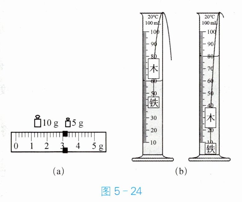 24. 用天平测一木块的质量,所用砝码情况和游码在标尺上的位置如图 5 - 24(a)所示。用量筒测其体积,量筒中水面的位置如图 5 - 24(b)所示。则所测木块的质量为