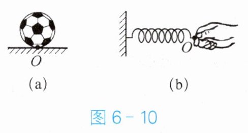 6. 请在图6 - 10(a)中画出地面对足球的支持力F的示意图。如图6 - 10(b)所示,弹簧的一端固定在墙上,手沿水平方向拉弹簧的另一端使弹簧伸长,请在O点画出弹簧对手的拉力F的示意图。