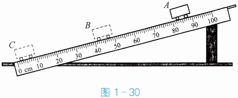 3. 在图 1 - 30 中的斜面上测量小车运动的平均速度,让小车从斜面上的 A 点由静止开始释放,分别测出小车到达 B 点和 C 点的时间,即可测出不同阶段的平均速度。下列关于实验数据的处理中正确的是(