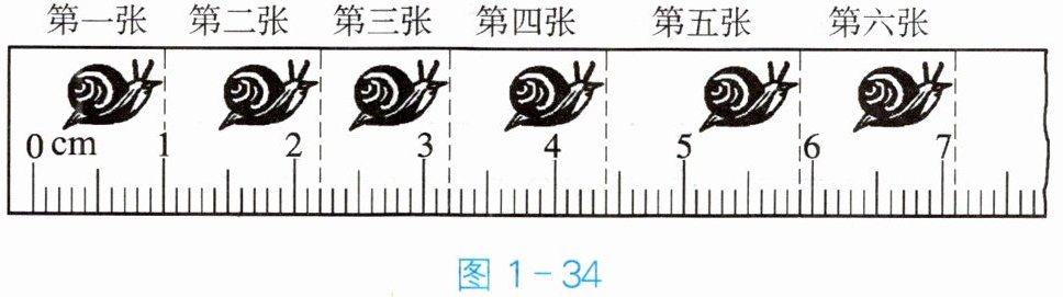 4. 某课外兴趣小组的同学们在研究蜗牛的运动情况时,让蜗牛在刻度尺上沿直线爬行,并每隔 10 s 拍摄蜗牛的位置,照片如图 1 - 34 所示。