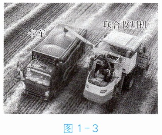 4. 小麦喜获丰收,人们会大量采用联合收割机抢收小麦。如图1-3所示,在收割过程中,卡车和联合收割机以相同快慢向同一方向行驶。此时,若以联合收割机为参照物,卡车是