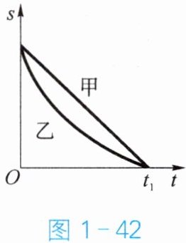 11. 甲、乙两车在平直公路上同时并排出发,且向着同一终点行驶,它们与终点的距离 s 随时间 t 变化的图像如图 1 - 42 所示。关于两车运动的过程,下列说法中正确的是(