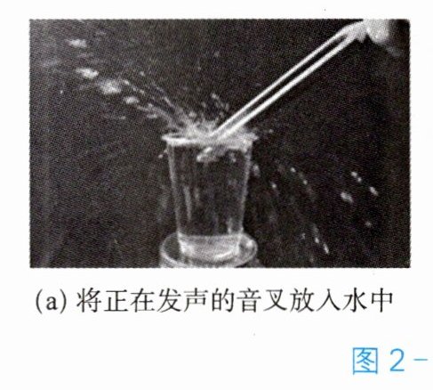 1. 如图 2 - 1 所示,将正在发声的音叉轻轻放入水中,会看到水花飞溅,而将不发声的音叉放入水中,看不到水花溅出,说明发声的音叉正在