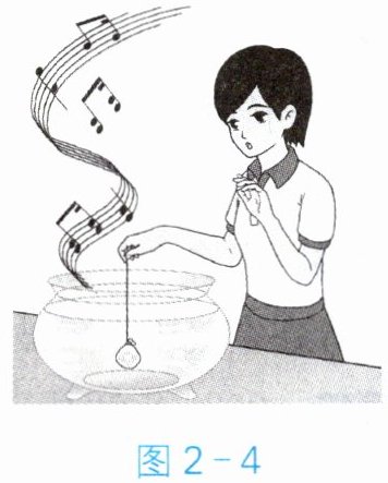 中传播。如图 2 - 4 所示,用塑料薄膜密封正在发声的音乐盒,将其放入水中后我们仍然能听到声音,说明声音可以在水