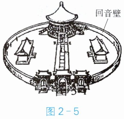 回来,这种现象称为回声。北京天坛内有个回音壁(图 2 - 5),人对着墙壁说话,在墙壁的许多位置都能听到,这是由于声音的反射而形成回声