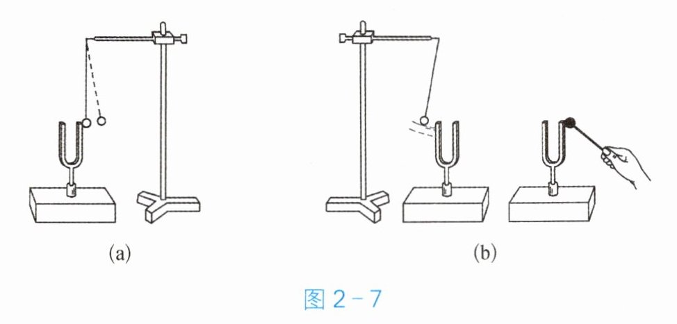 10. 如图 2 - 7(a)所示,用竖直悬挂的小球接触正在发声的音叉时,小球被多次弹开,这个现象说明