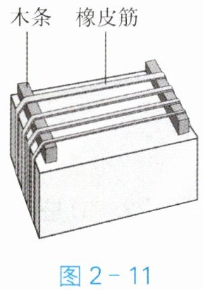 4. 如图 2 - 11 所示,小榕用粗细不同的橡皮筋制成了一个橡皮筋吉他。当她用相同的力拨动不同的橡皮筋时,会发出跟吉他一样的声音。当拨动松紧程度相同、粗细不同的橡皮筋时,她听到声音的
