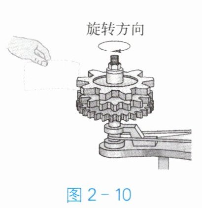 3. 如图 2 - 10 所示,用纸片分别接触转速相同、齿数不同的旋转齿轮,齿轮撞击纸片而发出声音。用纸片接触图中