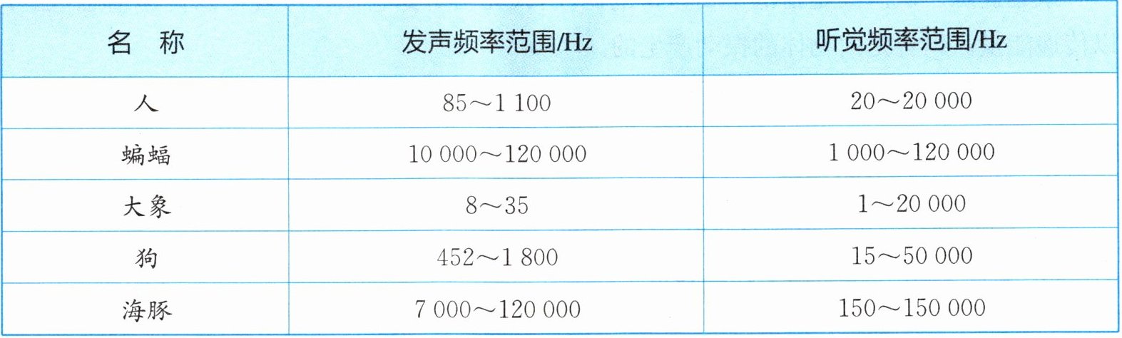 |名称|发声频率范围/Hz|听觉频率范围/Hz|
