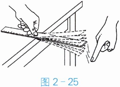 9. 如图 2 - 25 所示,将一把钢尺紧按在桌面上,其一端伸出桌面,拨动钢尺,能听到它振动发出的声音。若增加钢尺伸出桌面的长度,用相同的力拨动,则听到的声音(