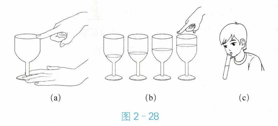 18. 如图 2 - 28(a)所示,将手指打湿后沿着高脚杯杯口摩擦,会听到声音。若往杯中不断加水,如图 2 - 28(b)所示,发声的音调将逐渐