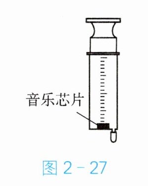 17. 如图 2 - 27 所示,将一块正在发声的音乐芯片放在注射器中,再将活塞推到底端,接着用橡胶帽封闭注射口,然后用力往外拉活塞,这时听到注射器中音乐芯片的声音会
