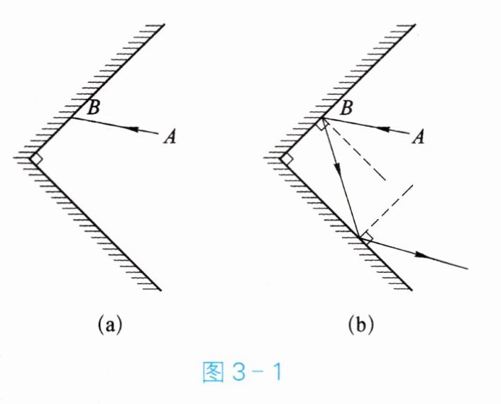 - 例题:自行车尾部安装有反光镜。夜间骑车时,反光镜能使射过来的光沿原来方向返回。反光镜结构如图3-1(a)所示,两平面镜相互垂直,当一束光$AB$射到其中一平面镜时,试作出所有反射光的光路图。
