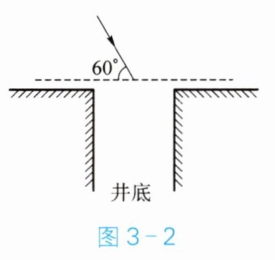 举一反三:若太阳光与水平方向的夹角为$60^{\circ}$,要用平面镜使太阳光竖直射入井底,请在图3-2中画出平面镜的位置,并标明反射角的大小。