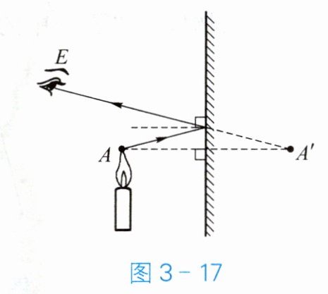 分析:如图 3 - 17 所示,发光点 $ A $ 发出的光经过平面镜反射,反射光进人人的眼睛,逆着反射光看过去,光似乎是平面镜里的像发出来的。利用平面镜成像的特点,先画出发光点 $ A $ 关于平面镜对称的像 $ A' $,连接 $ EA' $,则其与镜面的交点就是人射点。