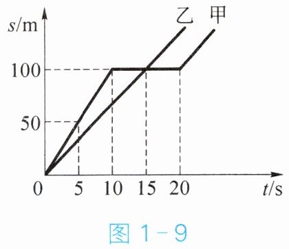 小郭和小华分别乘坐甲、乙两车外出旅游。两车同时从同一地点向东做直线运动,它们运动的路程$s随时间t变化的图像如图1 - 9$所示。由图可知,在(