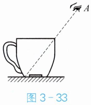 - 举一反三:如图 3 - 33 所示,小明在 A 处看不到硬币。向杯中缓缓注水后,又能看到硬币了,这是由于光从