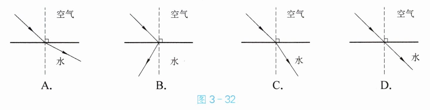潜入水中工作的潜水员看见岸上树梢的位置变高了。图 3 - 32 中,能正确说明产生这一现象的原因是(