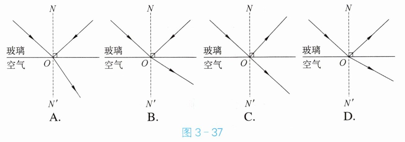 2. 光从玻璃斜射到空气,在玻璃与空气的交界面发生折射和反射。图 3 - 37 中符合实际情况的是(