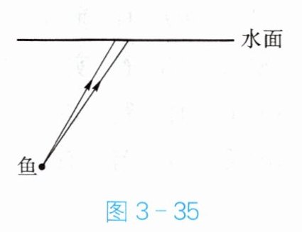 5. 请根据光的折射规律,在图 3 - 35 中画出岸上的人所看到的水中鱼的像,以及成像的大致光路图。