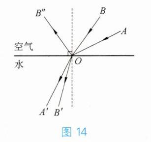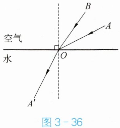 1. 如图 3 - 36 所示,OA'是入射光线 AO 的折射光线,请在图中画出入射光线 BO 的反射光线和该入射光线在水中的折射光线的大致方向。
