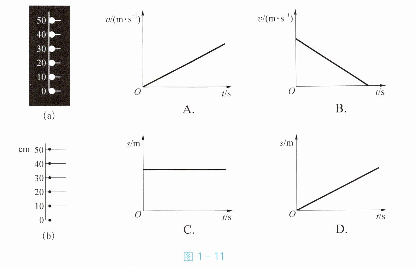 5. 小昕用手机软件模拟频闪摄影,每隔相同时间记录小球所在位置,图$1 - 11(a)$为实验图片,图$1 - 11(b)$为等效图。下列关于小球运动过程中相关物理量随时间变化的图像中正确的是(