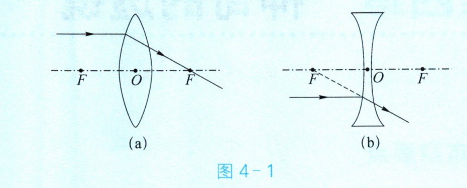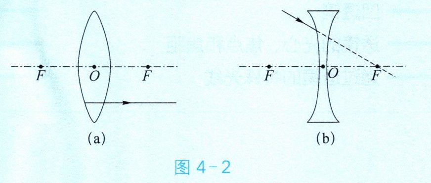 如图4-2所示,入射光线通过焦点,请画出图(a)中的入射光线和图(b)中的出射光线。