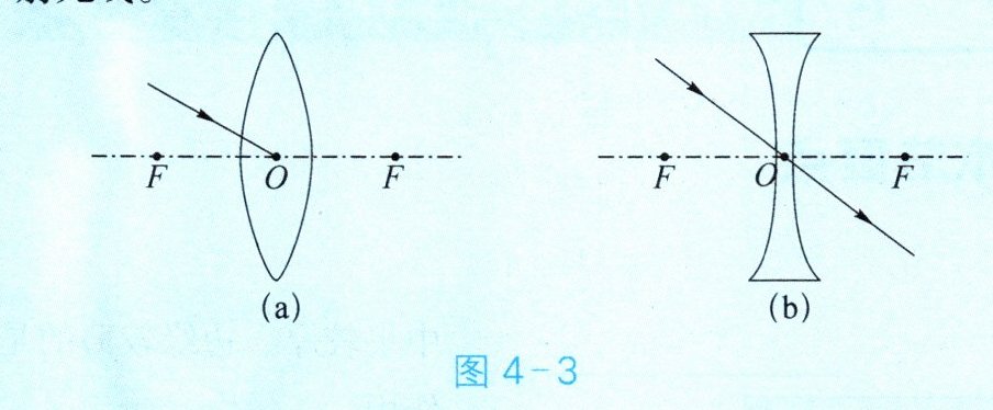 如图4-3所示,入射光线通过光心,请画出图(a)中的出射光线。