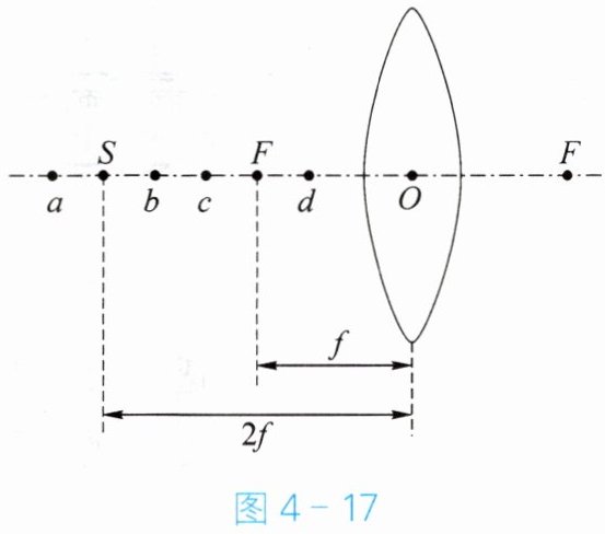 3. 某同学做“探究凸透镜成像的规律”实验时,所用凸透镜的焦距为f,保持凸透镜位置不变,如图4-17所示,使烛焰先后位于a、b、c、d四点,并分别调整光屏的位置。分析可知,把蜡烛放在