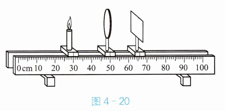 8. 如图4-20所示,蜡烛、凸透镜及光屏放置于光具座上,此时光屏上恰好能得到一个清晰的像。由此可以判断,所用凸透镜的焦距是(