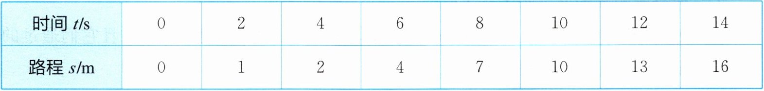 |路程$s/m$ | $0$ | $1$ | $2$ | $4$ | $7$ | $10$ | $13$ | $16$ |