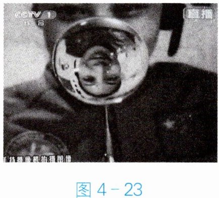 举一反三 在我国首次“太空授课”中,航天员在中国空间站内用水球做实验,她的像映在水球中(图 4 - 23)。水球成像原理与