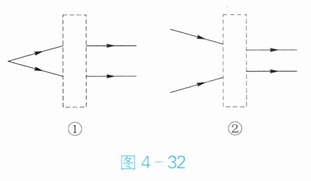 (选填“前”或“后”)。图 4 - 32 是光通过透镜前后的情形(图中虚线框内的透镜未画出),矫正远视眼时只要在眼睛前面放置图①