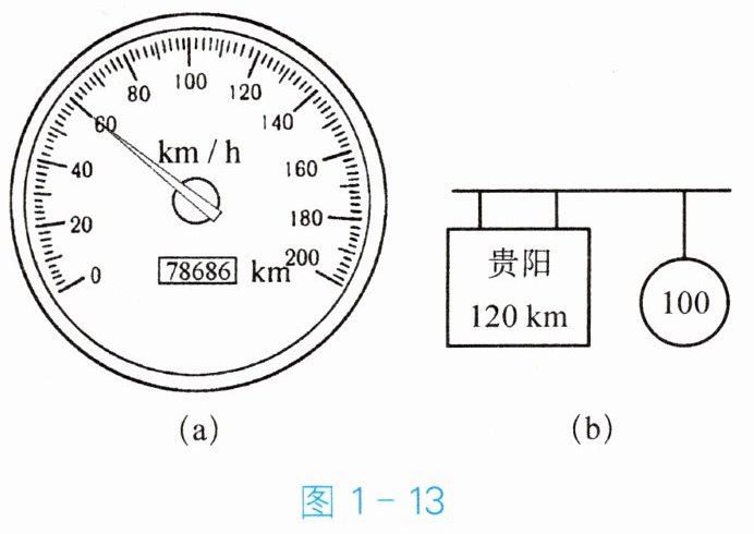 10. 小聪的爸爸驾车去贵阳,从普定进入高速路口时,看了一下此刻的速度表[图$1 - 13(a)$],又看到此处的路牌[图$1 - 13(b)$]。根据情境回答以下问题: