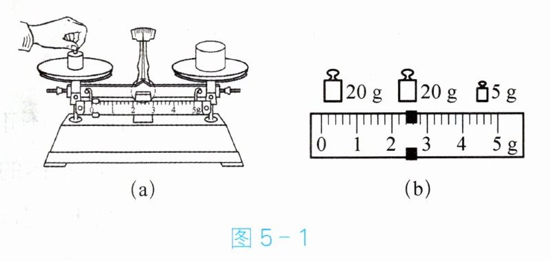 例题 小明同学在测量物体质量的实验中,调节天平平衡后,按如图 5 - 1(a)所示的方法来测量物体的质量。
