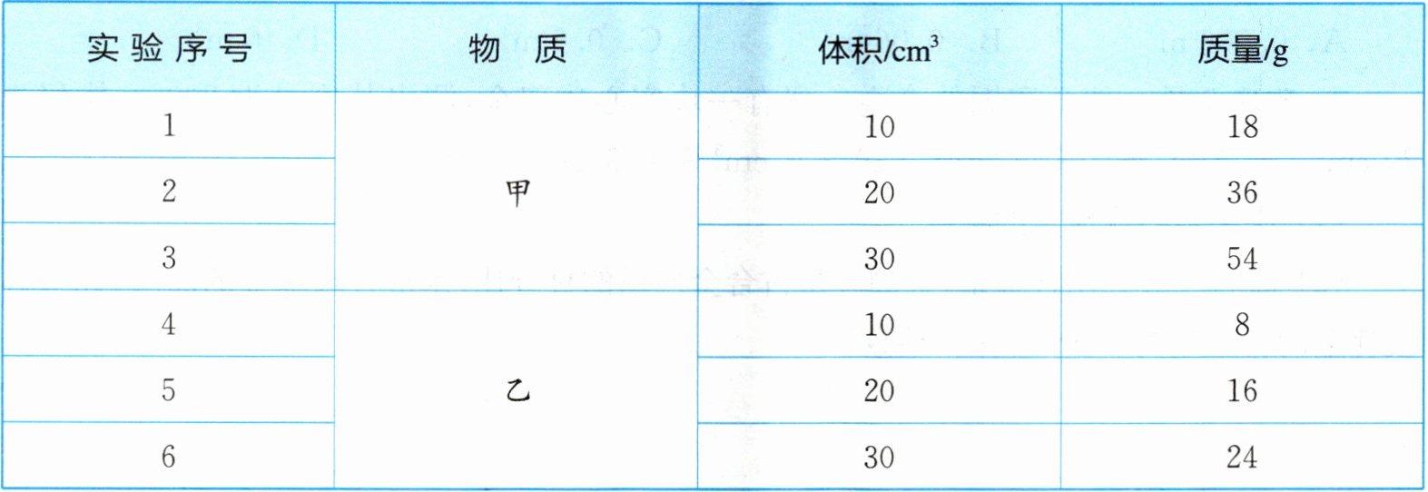|实验序号|物质|体积$/cm^{3}$|质量$/g$|