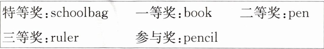 三、Look,read and fill. 周日恬恬过生日,朵朵、花花、敏敏、君君、天天带着礼物去参加恬恬的生日聚会,他们在去恬恬家的路上,看到一家新开业的文具店正在举办抽奖活动,他们全部参与了活动并且都抽到了奖品。朵朵抽到了特等奖,她很高兴。其他人抽到的奖品是什么呢?请根据图片提示和奖品详情补全句子。