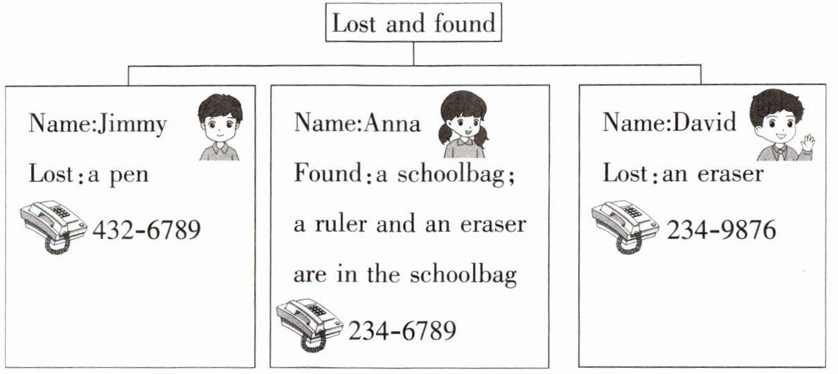 )4. David can call (打电话) Anna at ____ to find (找到) his (他的) eraser.A. 432-6789 B. 234-9876 C. 234-6789