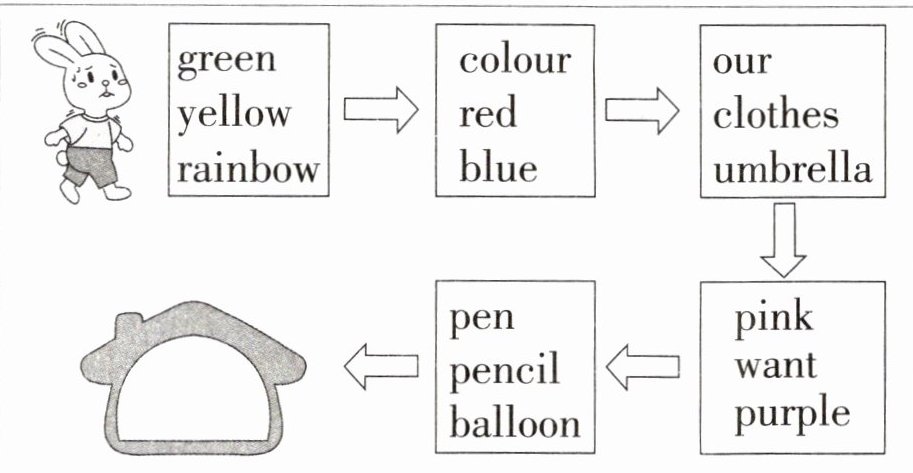 一、Read and circle. 小兔子在森林里迷路了,请圈出每组中不同类的单词,帮助她找到回家的路。