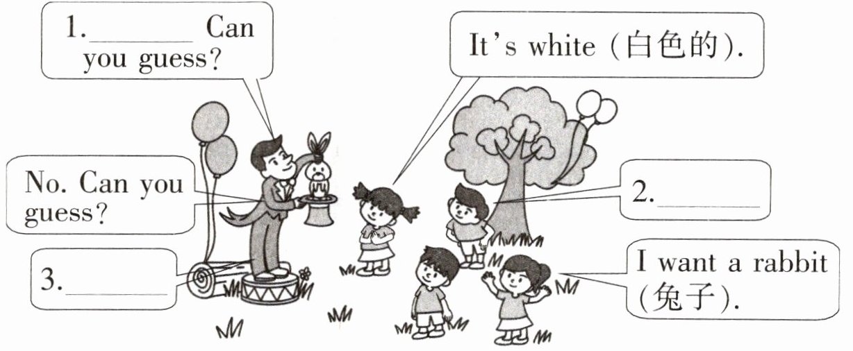 同学们来到了露营地,看到魔术师正在变魔术,请根据所给内容选择正确的选项完成对话。A.What colour is it?