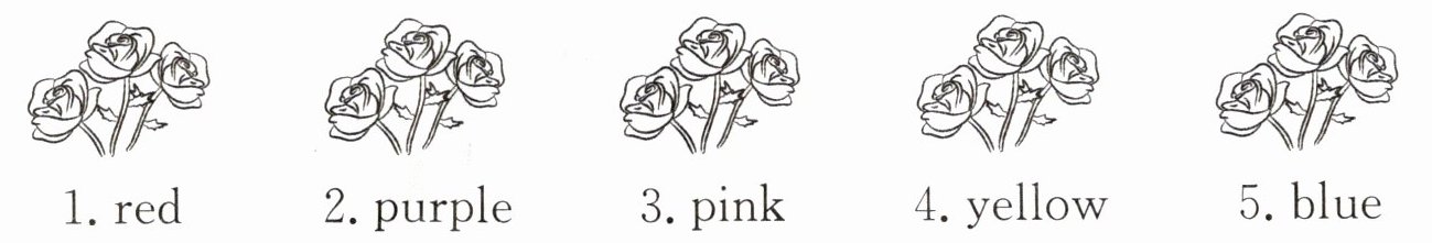 二、Read and colour. 在写生过程中,同学们遇到了公园管理员正在为公园里的月季花制作标志牌,请大家一起来帮忙,为标志牌上的花涂上正确的颜色吧!
