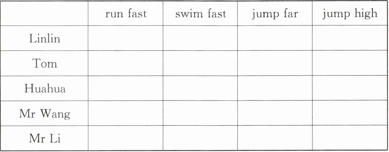 Linlin, Tom and Huahua are good friends. Linlin likes running. She can run fast. But Tom can’t. He can swim fast. Huahua can jump far. And he can swim fast, too. Look! Their teachers Mr Li and Mr Wang are running. Who is the winner (胜利者)? Oh, Mr Wang is the winner. He can run very fast. Mr Li is strong. He can jump very far and jump very high.