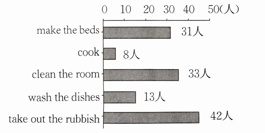 二、Look, read and fill. 乐乐调查了班上同学平时会为父母做的家务。根据条形统计图,完成调查报告。(每人不止做一项家务)
