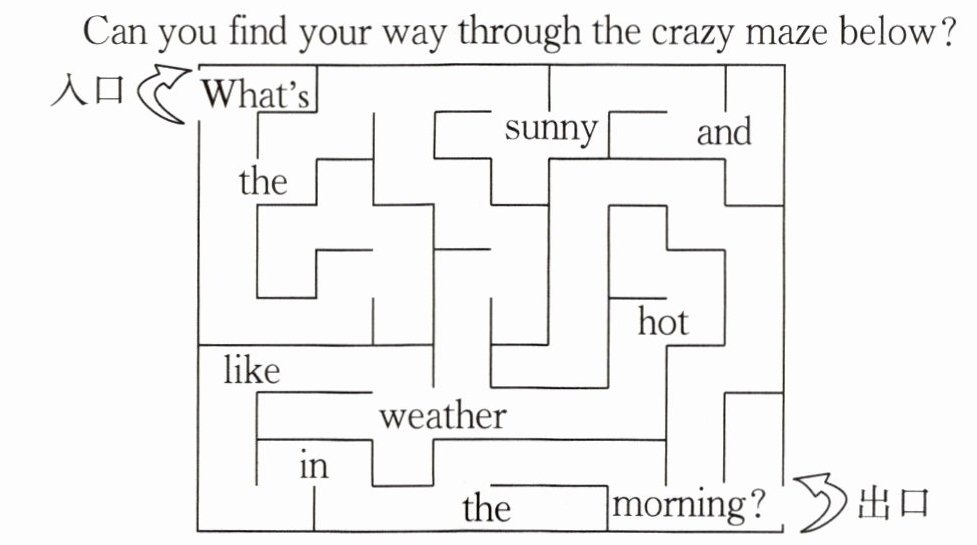 三、Look,read and write. Amy 给 Sam 设计了一个询问天气的迷宫,让我们帮助 Sam 按正确的顺序走出迷宫,并将正确的句子写在四线三格中。