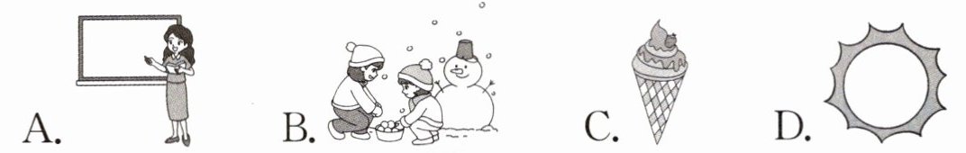 )4. —It’s snowy today.—Hooray! Let’s play in the snow.