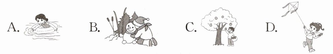 一、Read and choose. 来自天南地北的孩子们正在分享他们四季不同的活动。给句子选择相符的图片。